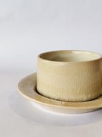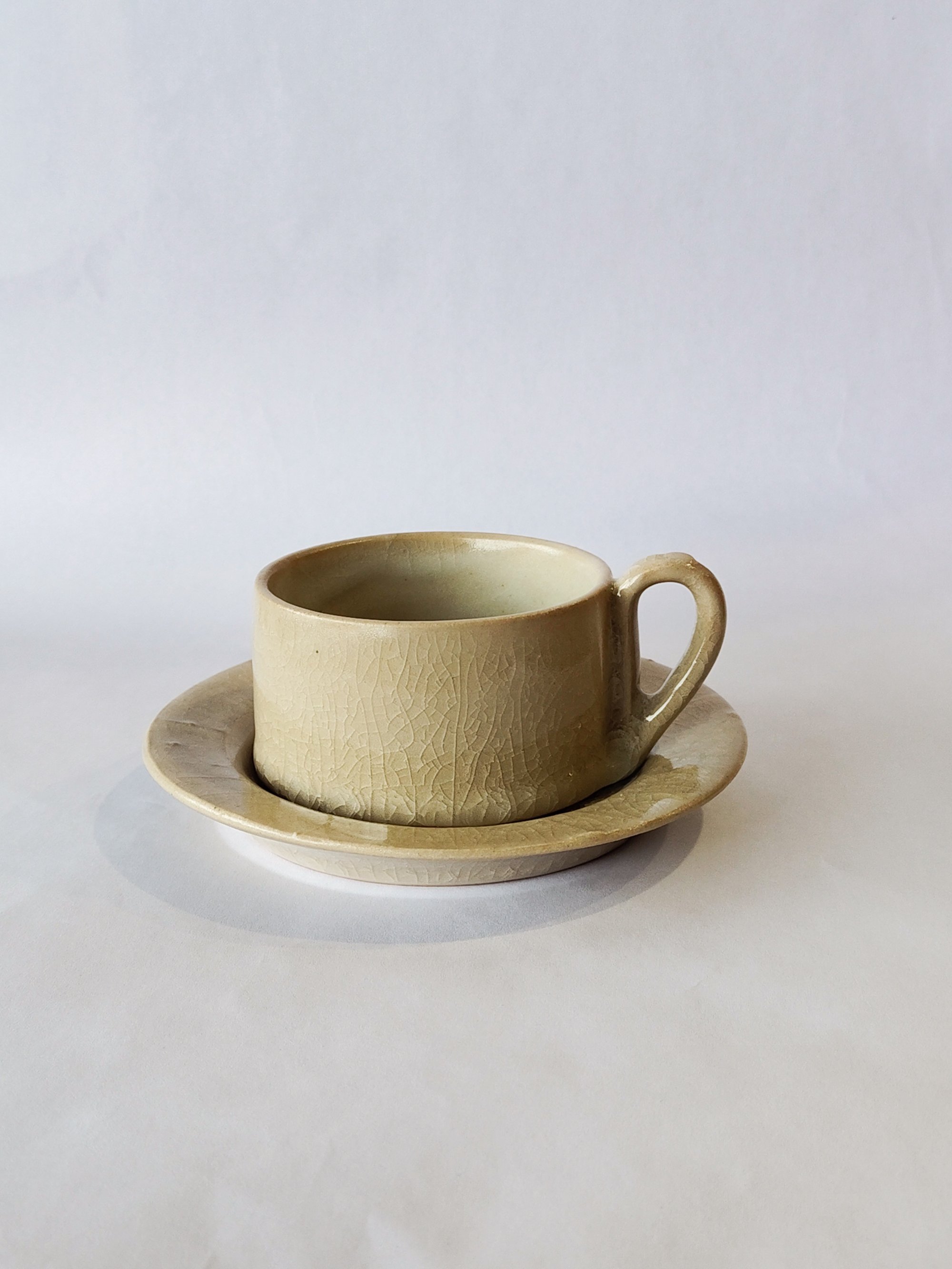 Coffee cup with thin, small handle and saucer in stoneware, craquelè glaze on the outside and matte and matte glaze on the inside of the cup