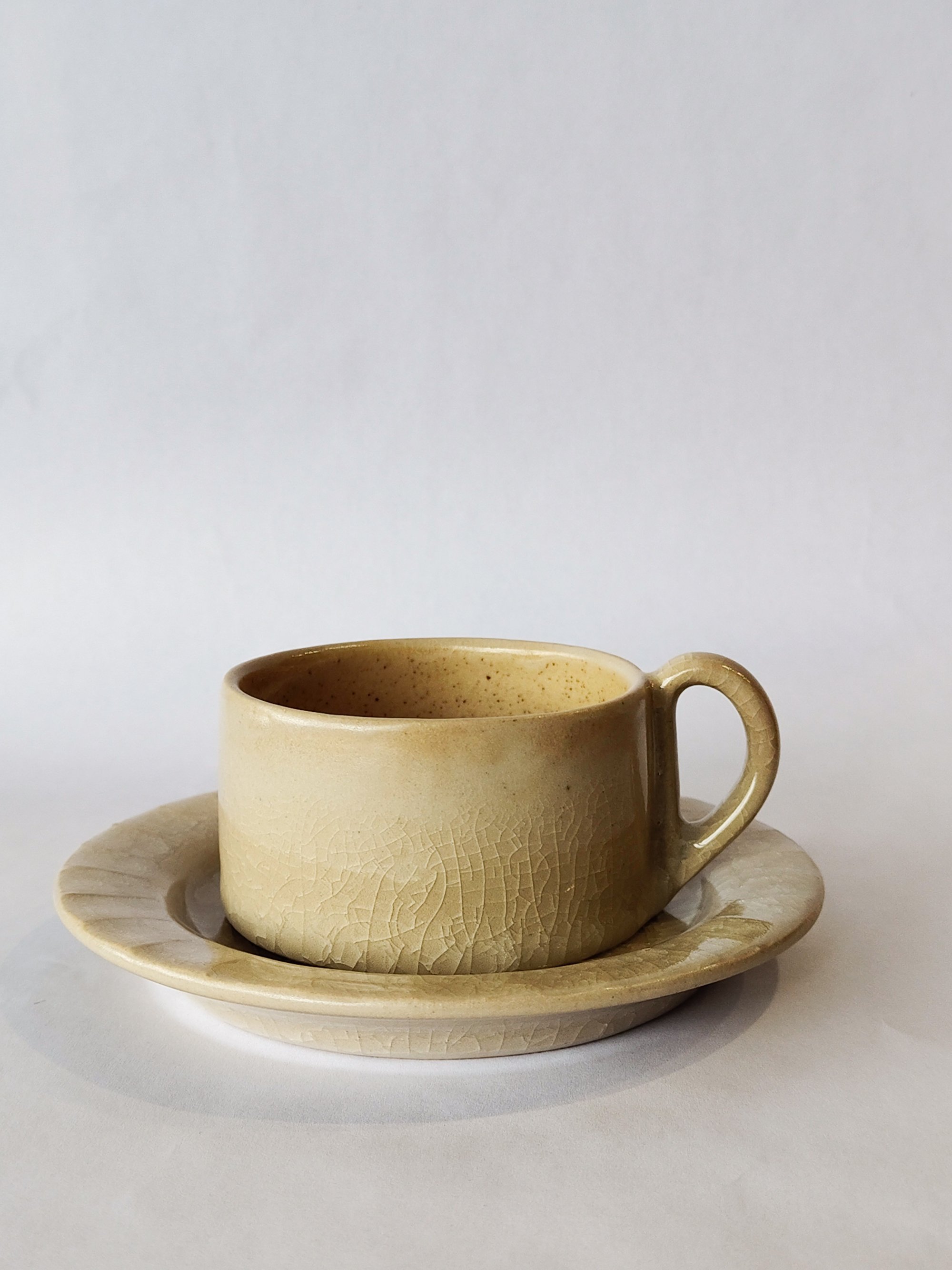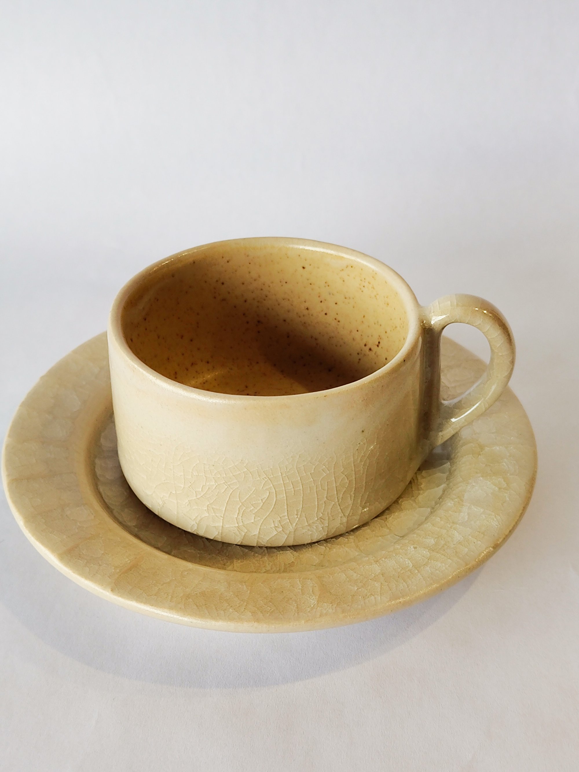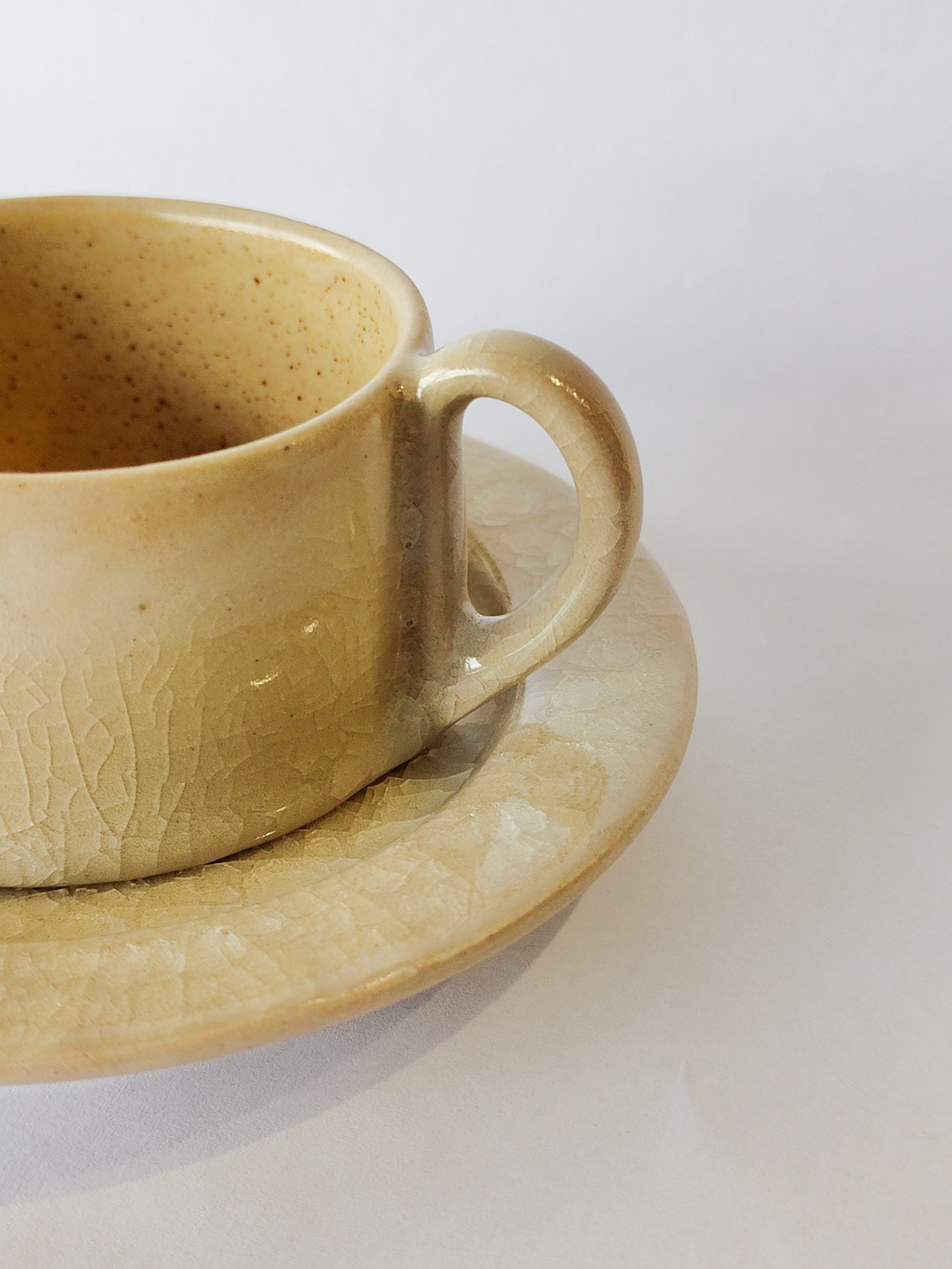 Coffee cup with thin, small handle and saucer in stoneware, craquelè glaze on the outside and matte and speckled glaze on the inside of the cup