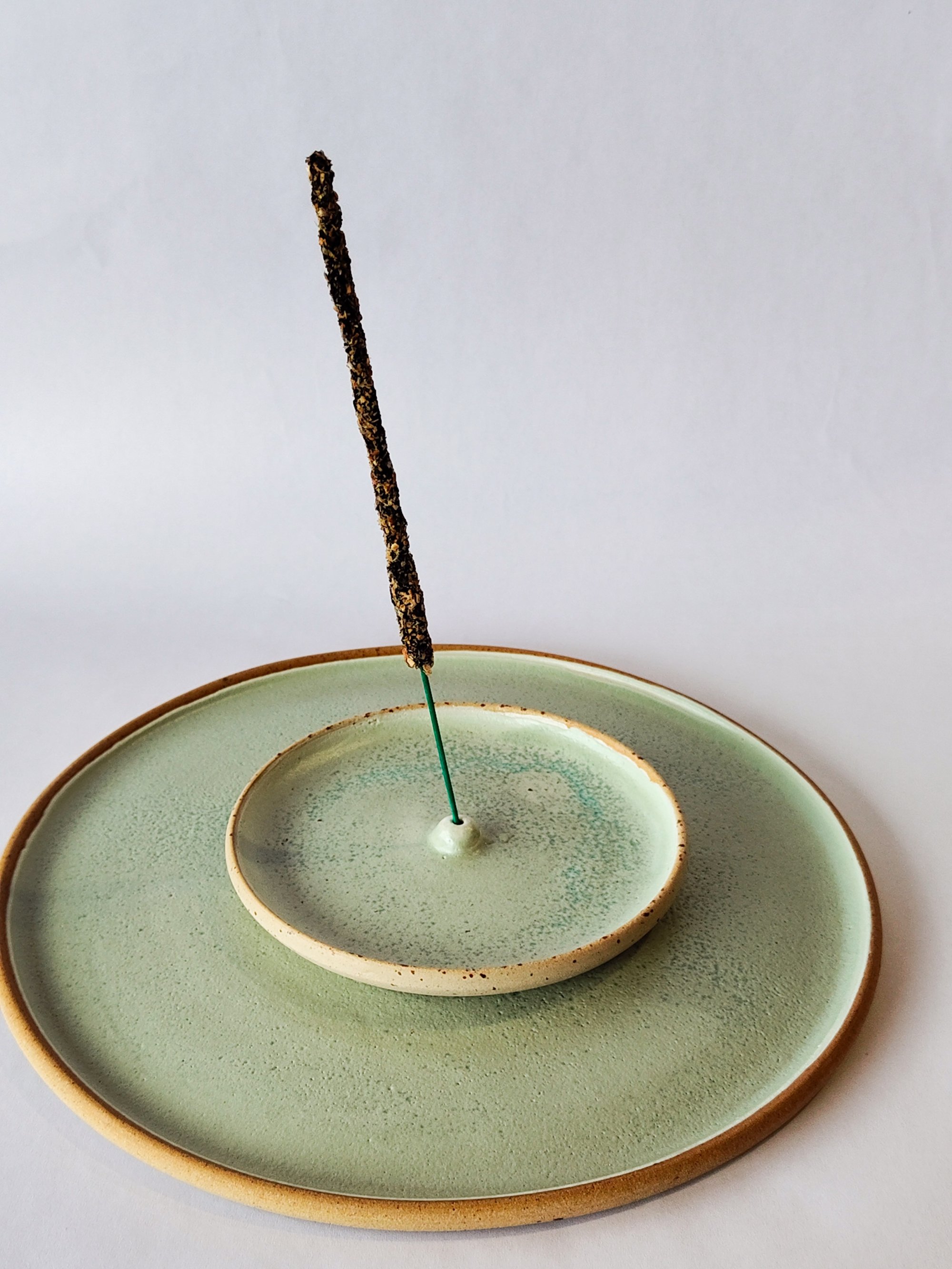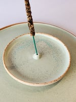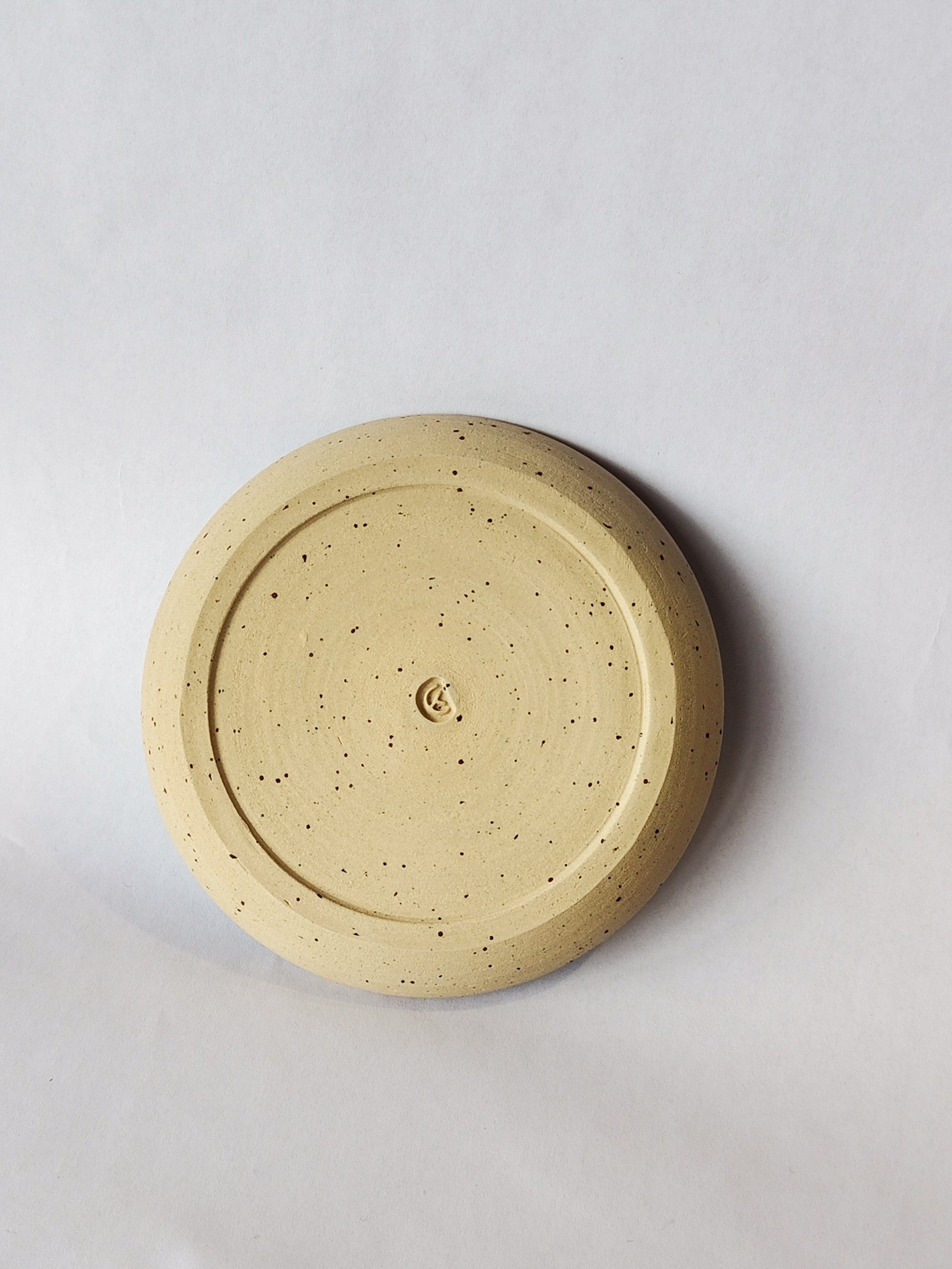 Speckled stoneware incense burner saucer, glazed on the inside and left raw on the outside.