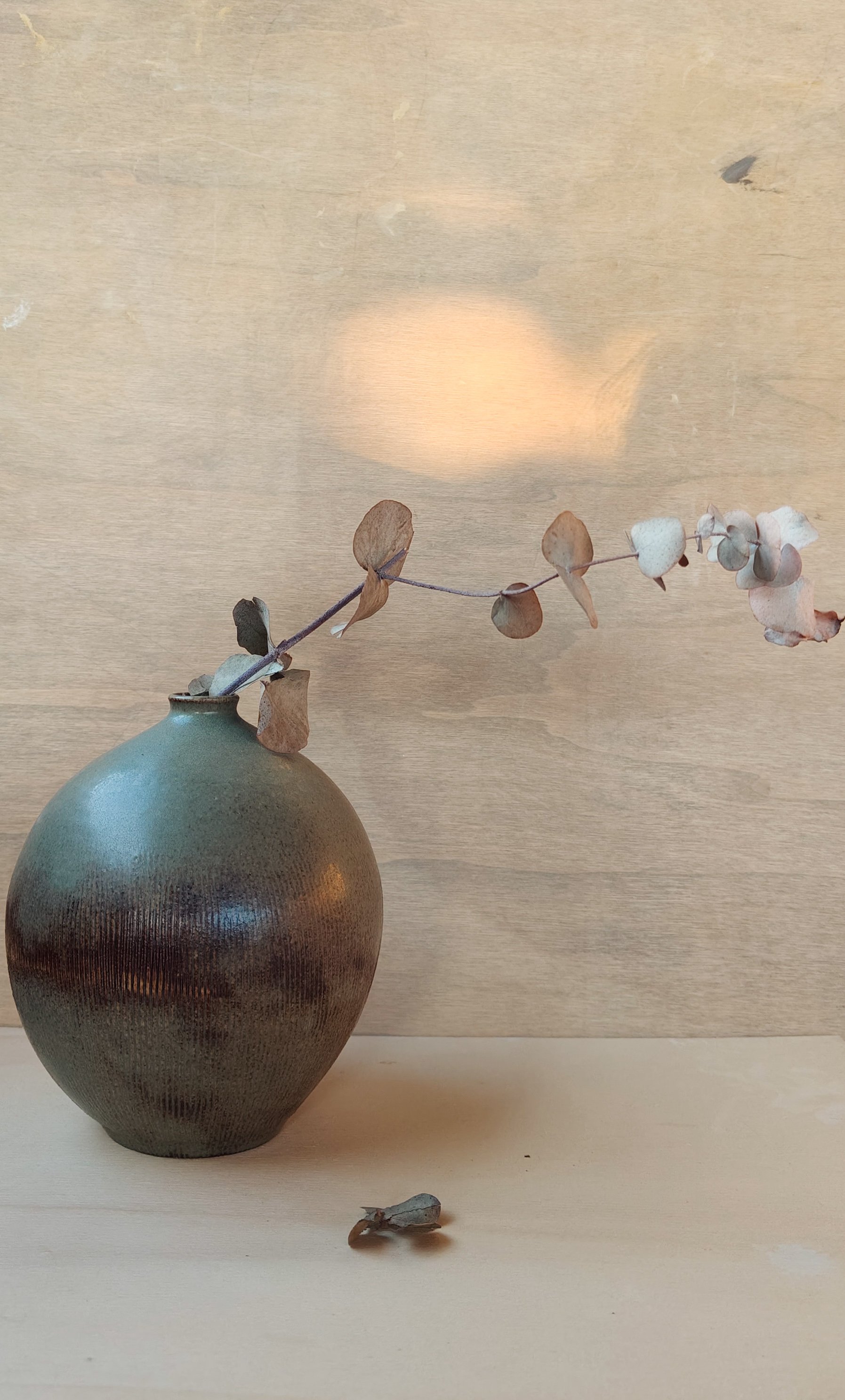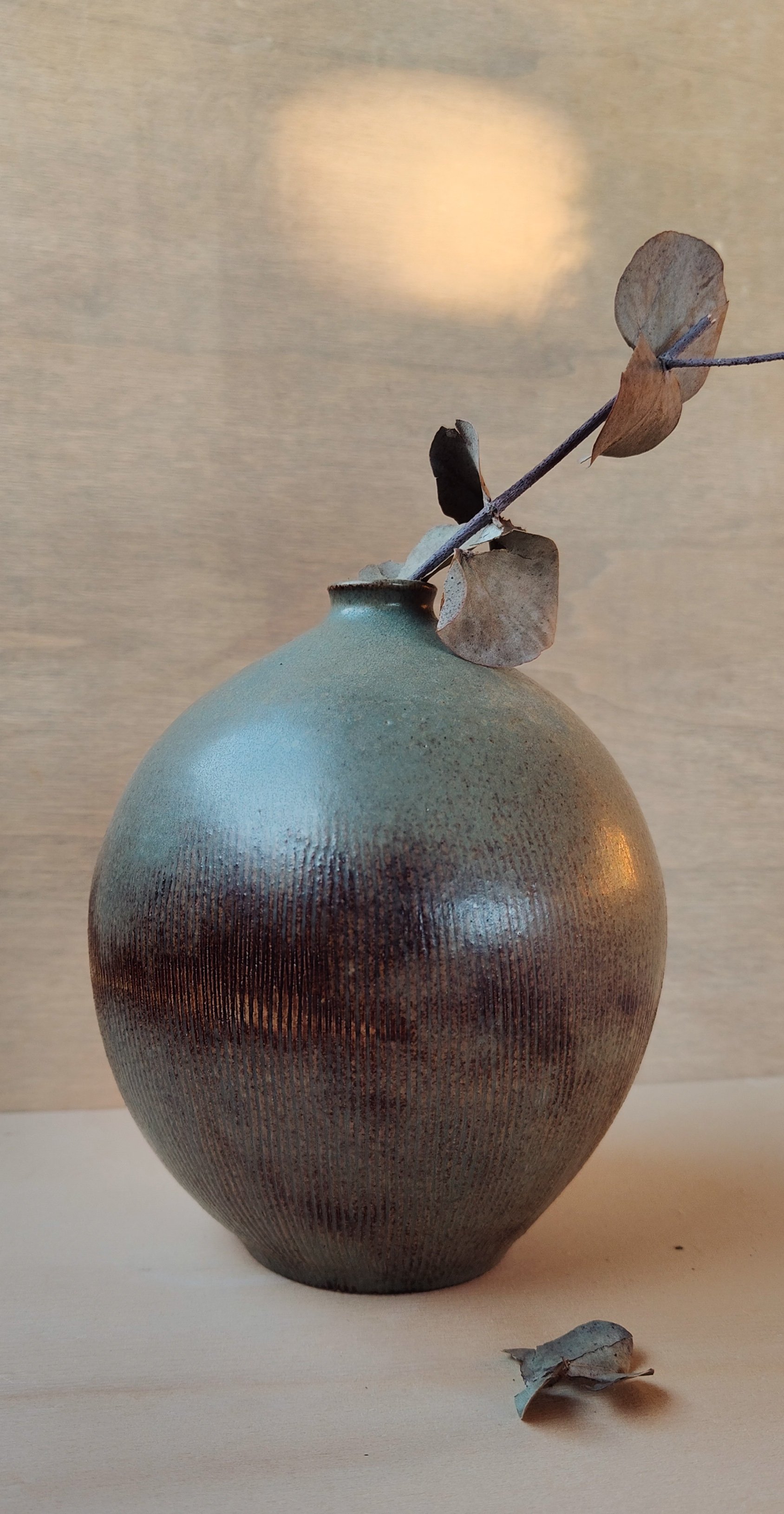 A rounded moon jar with balanced silhouette and a small, refined opening.