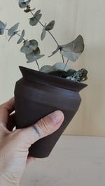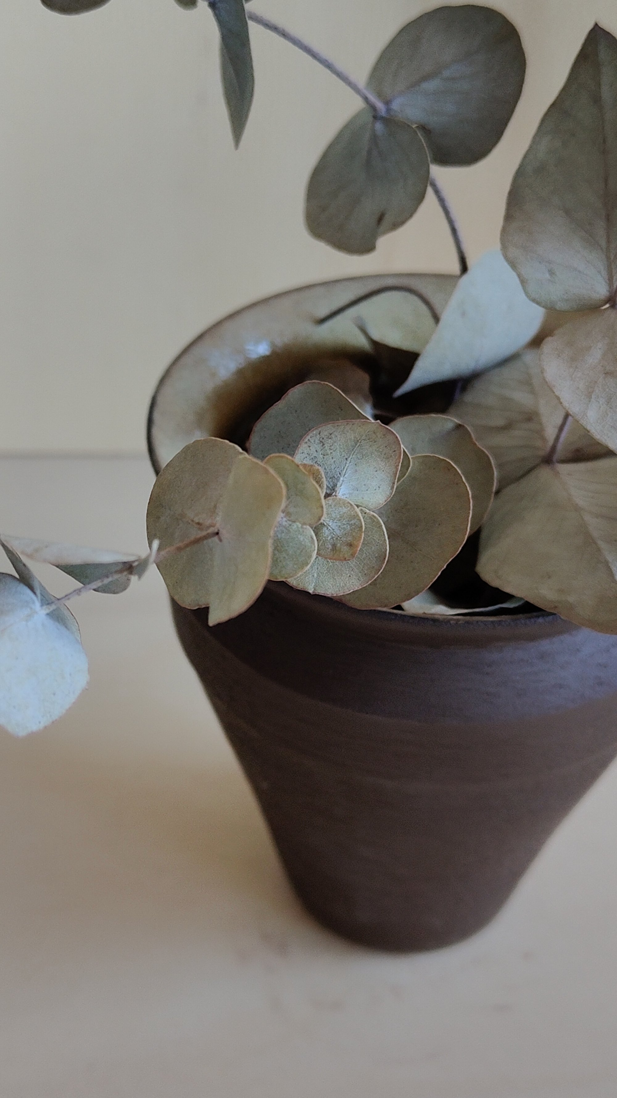 This vase combines strength and delicacy: the bold brown clay body is left unglazed, while the interior is coated in a warm ochre glaze that reflects the light.